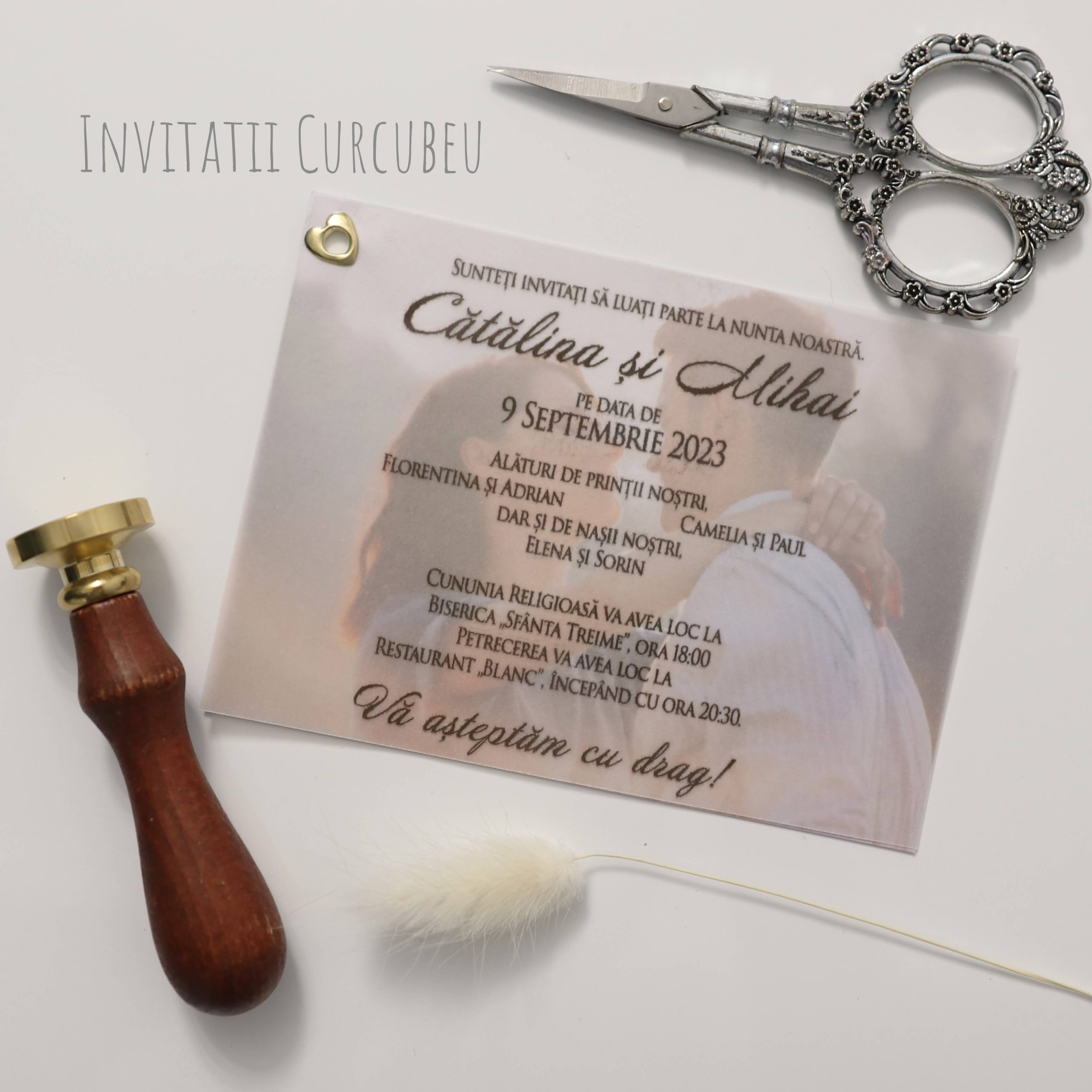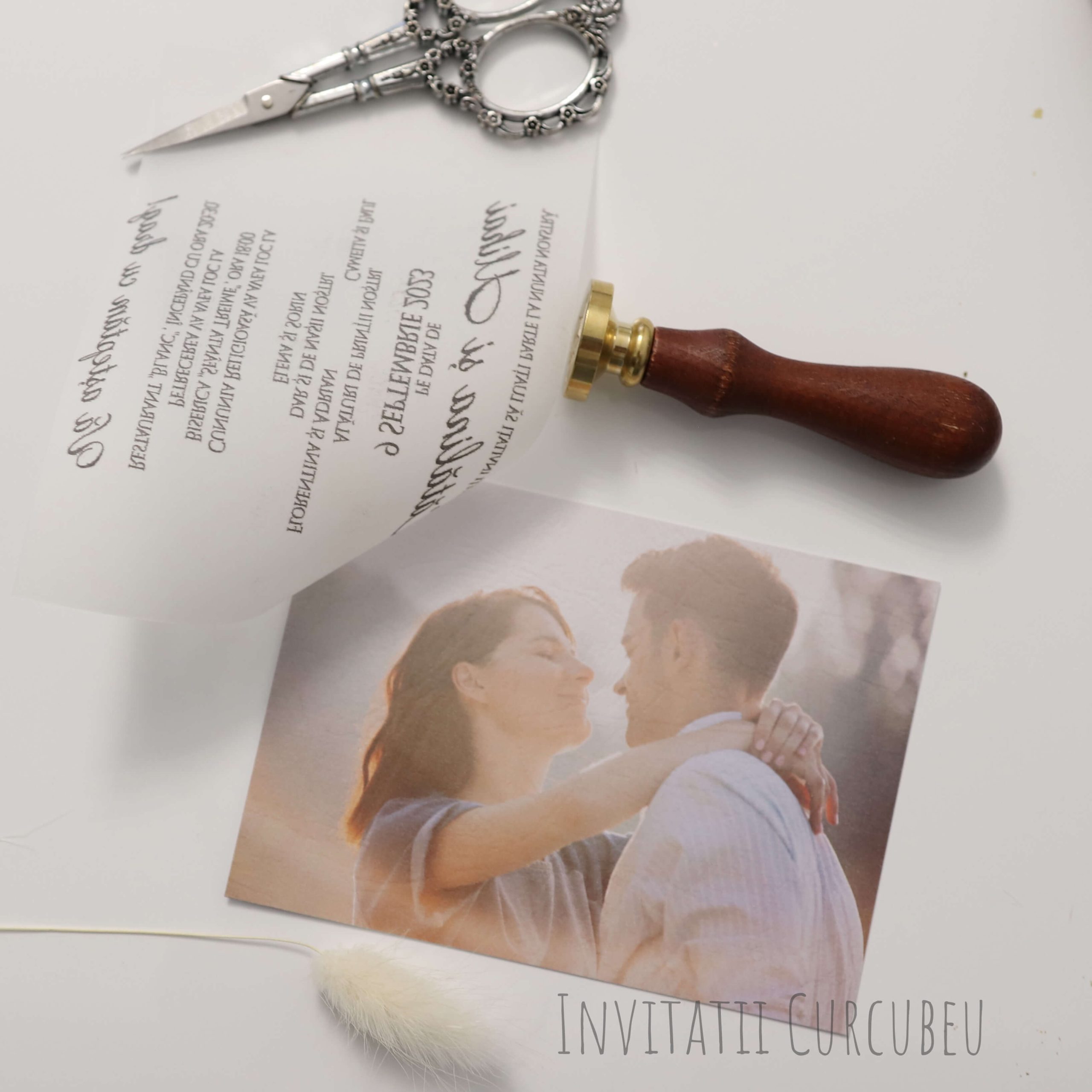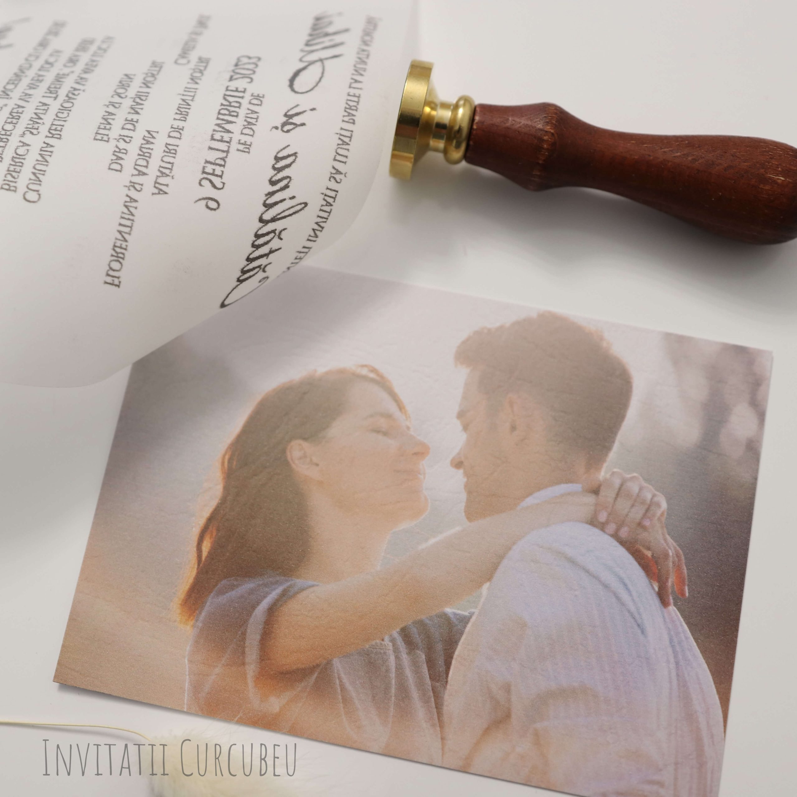 Invitatie de nuntă atipică cu poză. Legătura între invitație și poză este făcută printr-o capsă.