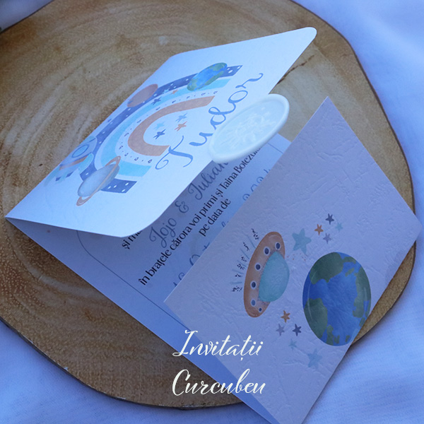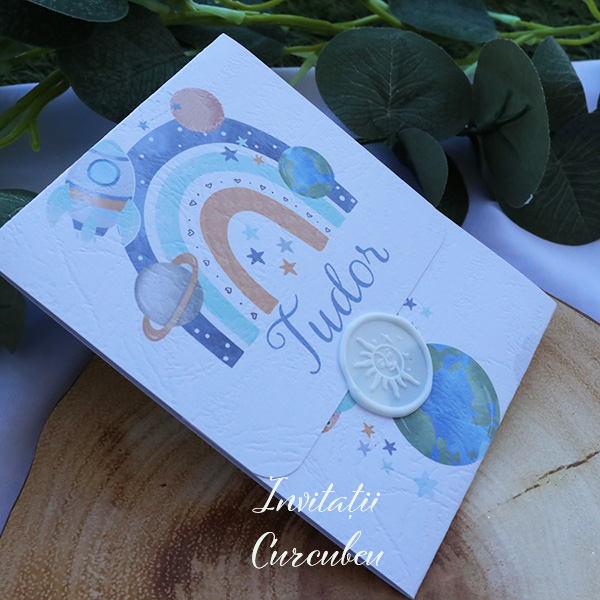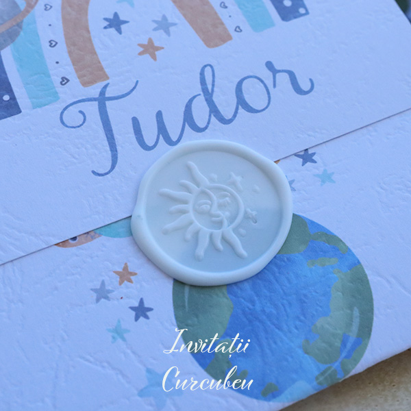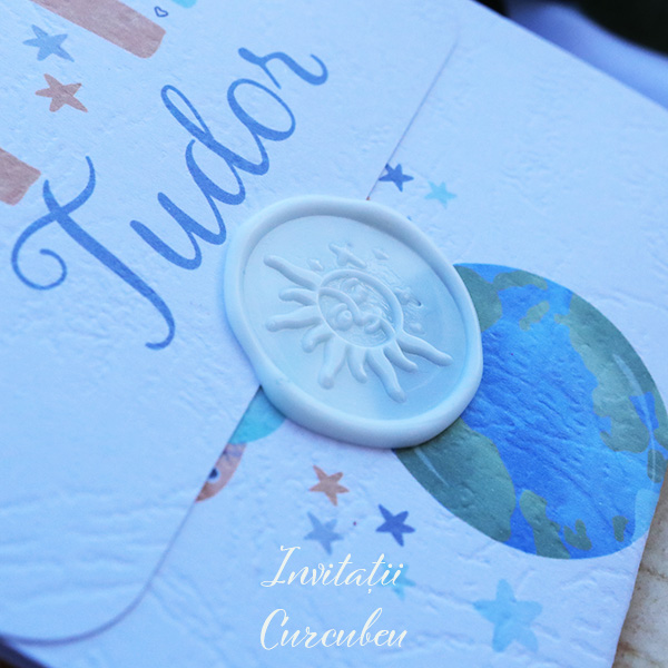Invitație de Botez – Baby Galaxy are o copertă albă ce conferă invitației o notă de eleganță și sobrietate. În același timp, sigiliul bleo adaugă un element jucăuș.