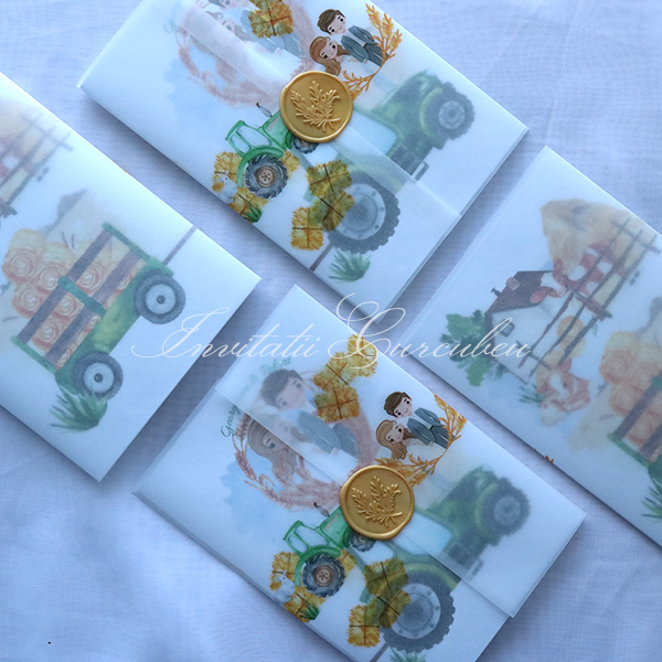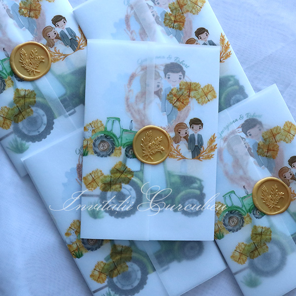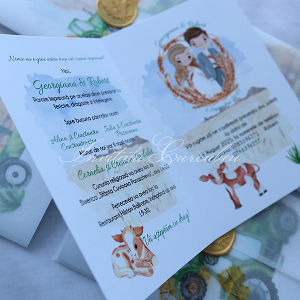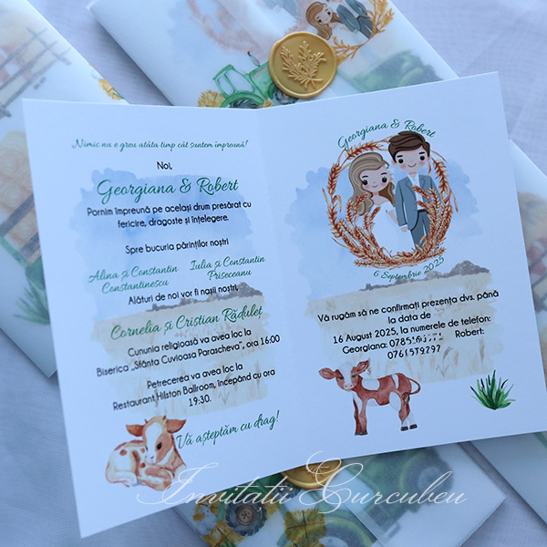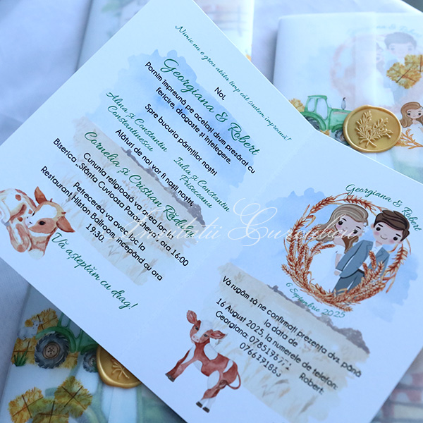Textul invitației poate fi personalizat, pentru a reflecta stilul și tematica dorită de miri. Acesta poate include elemente tradiționale sau mesaje originale, care adaugă un plus de farmec și autenticitate invitației. Alegerea acestei invitații va impresiona cu siguranță toți invitații, stabilind tonul unei nunți deosebite, cu teme inspirate din viața rurală.