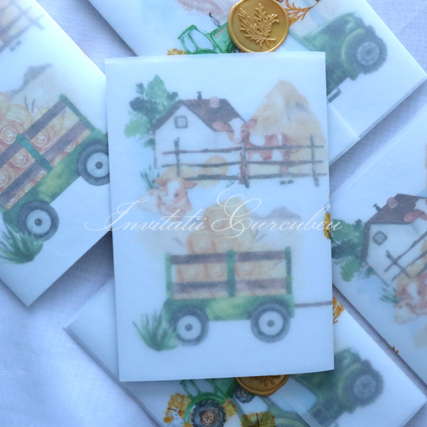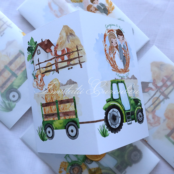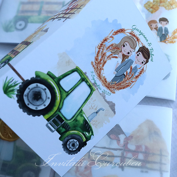 Invitația de nuntă Agricultură este decorată cu elemente ce evocă natura, câmpurile și simboluri ale acestui domeniu – tractoare, flori de câmp sau peisaje rurale. Fiecare detaliu este gândit pentru a reflecta esența unei vieți trăite în mijlocul naturii, făcând această invitație perfectă pentru cuplurile care doresc să își transforme nunta într-o adevărată sărbătoare a agriculturii.