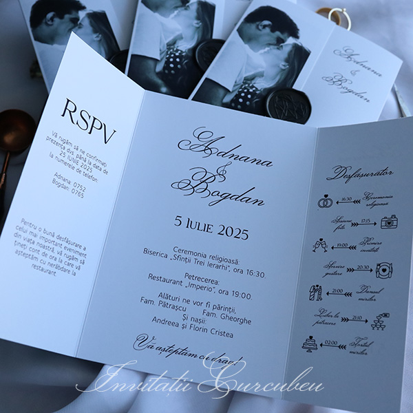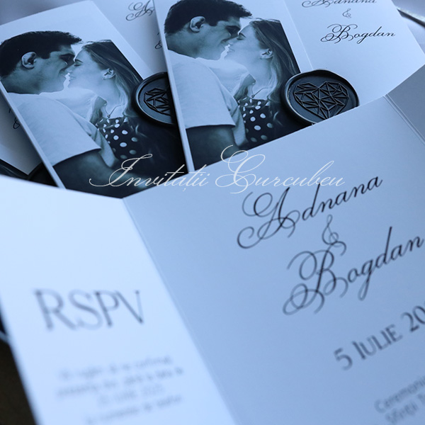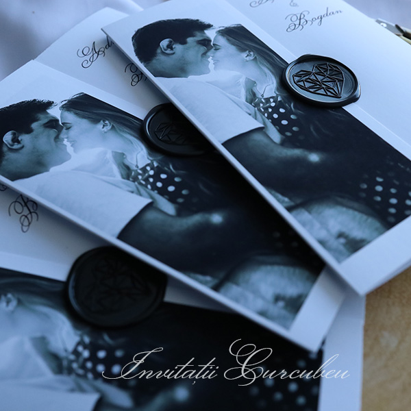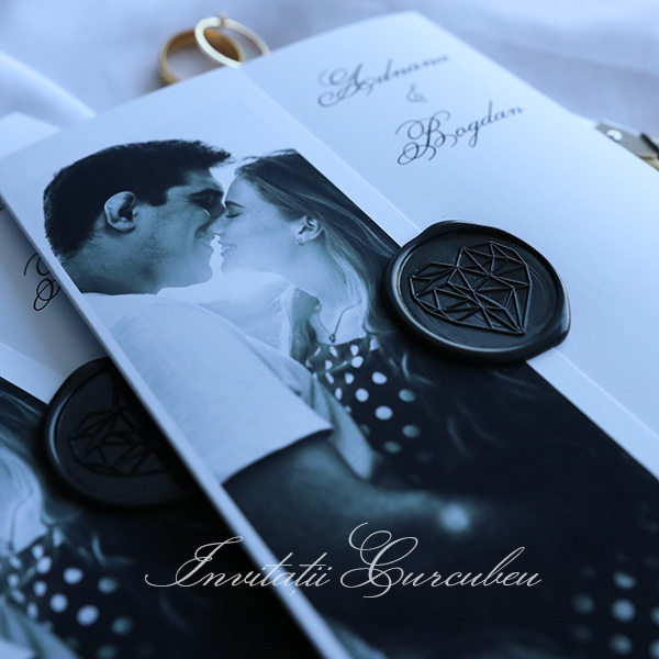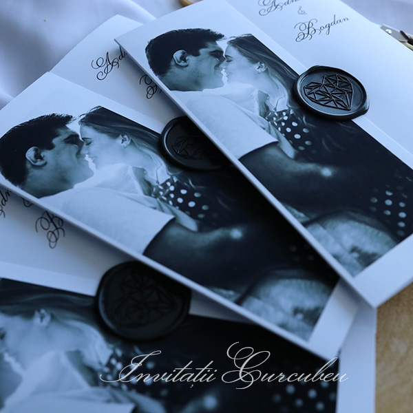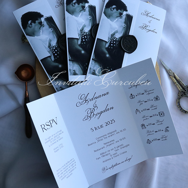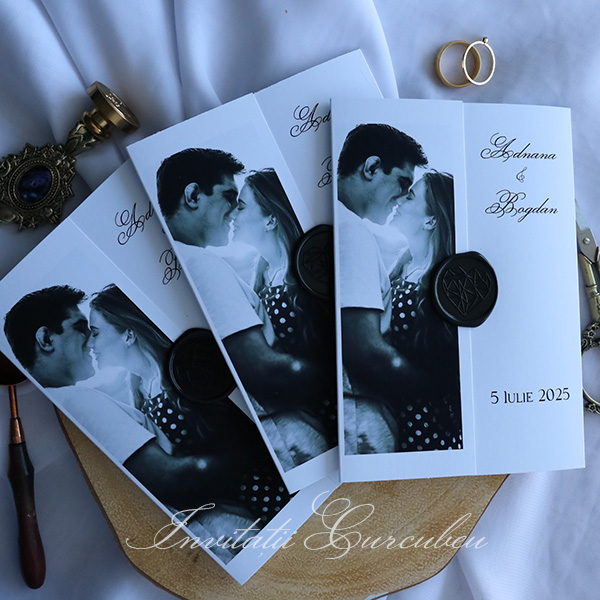 Pe exteriorul invitației se regăsește o fotografie alb-negru, un detaliu personalizat care adaugă un caracter unic. Această poză, cu detaliile sale subtile și contrastul puternic, reflectă o atmosferă intimă și elegantă, oferind o fereastră vizuală în povestea voastră de iubire. Fie că este o imagine de la o sesiune foto sau o fotografie semnificativă pentru cuplu, aceasta completează perfect designul invitației.
