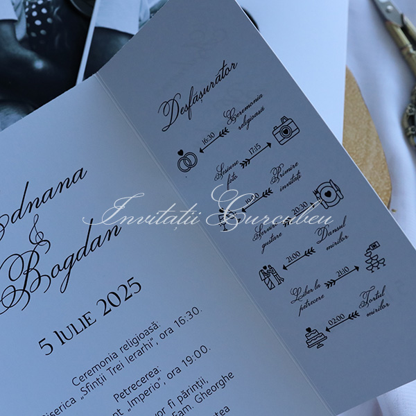 Paleta de culori alb-negru face ca invitația să fie simplă, dar extrem de sofisticată, atrăgând atenția asupra esenței evenimentului fără a fi prea încărcată. Acest design este ideal pentru cei care apreciază stilul curat, dar totodată vor un detaliu personalizat care să adâncească legătura cu momentul special al nunții.
