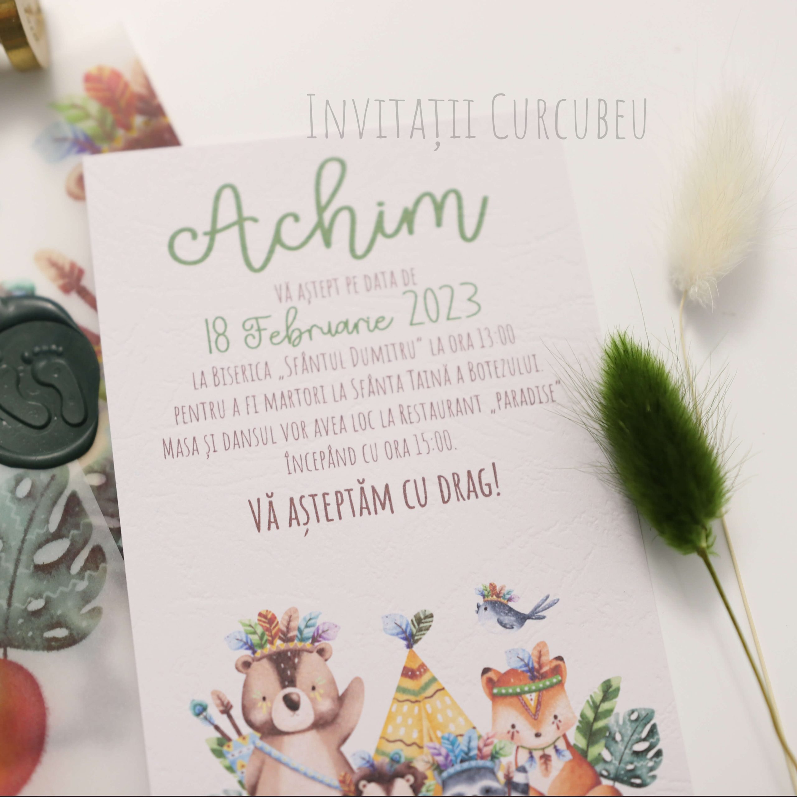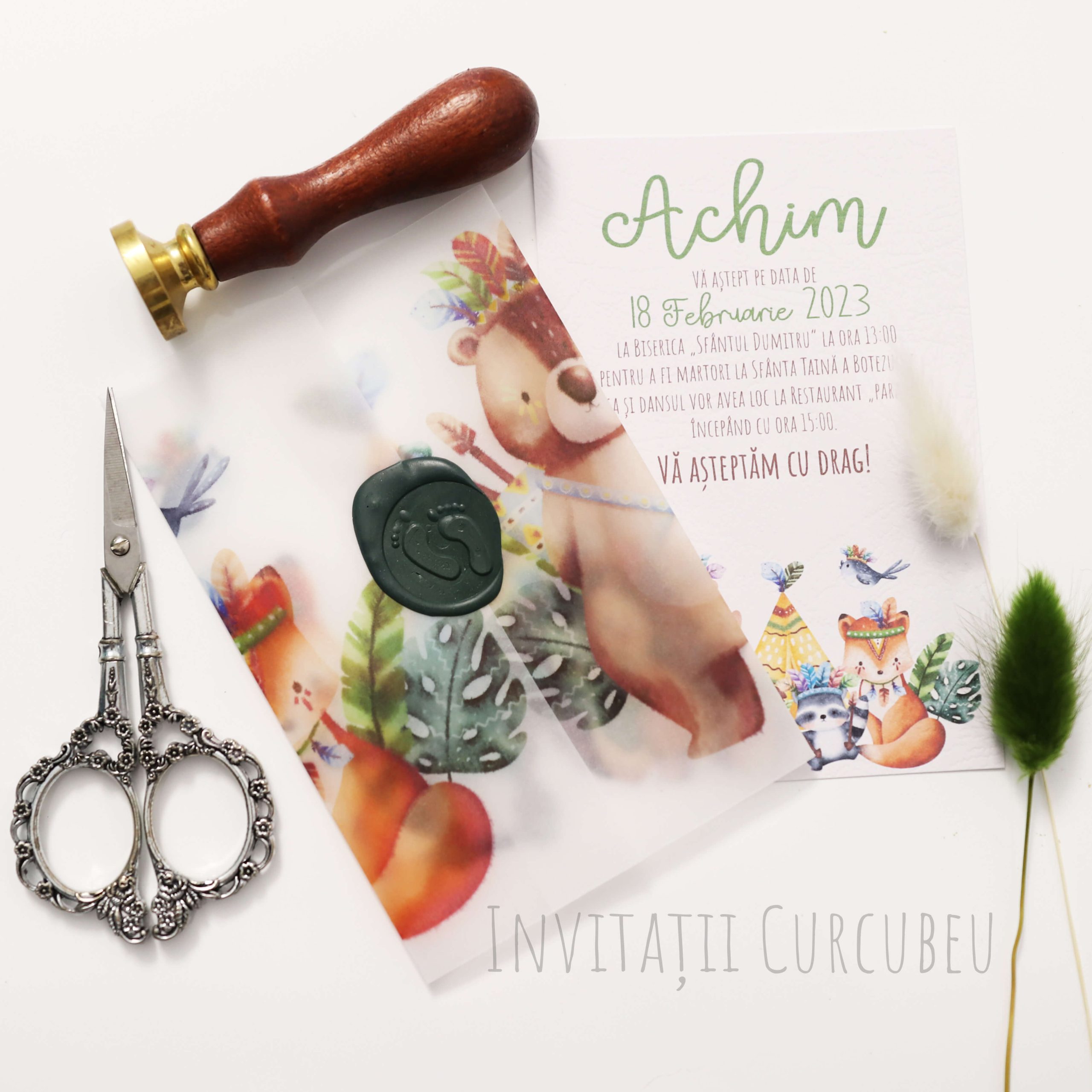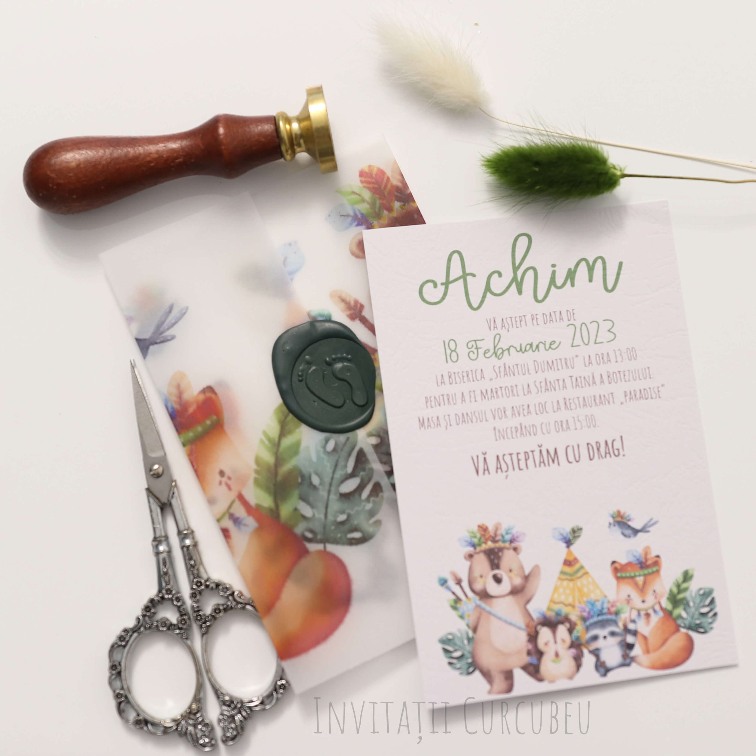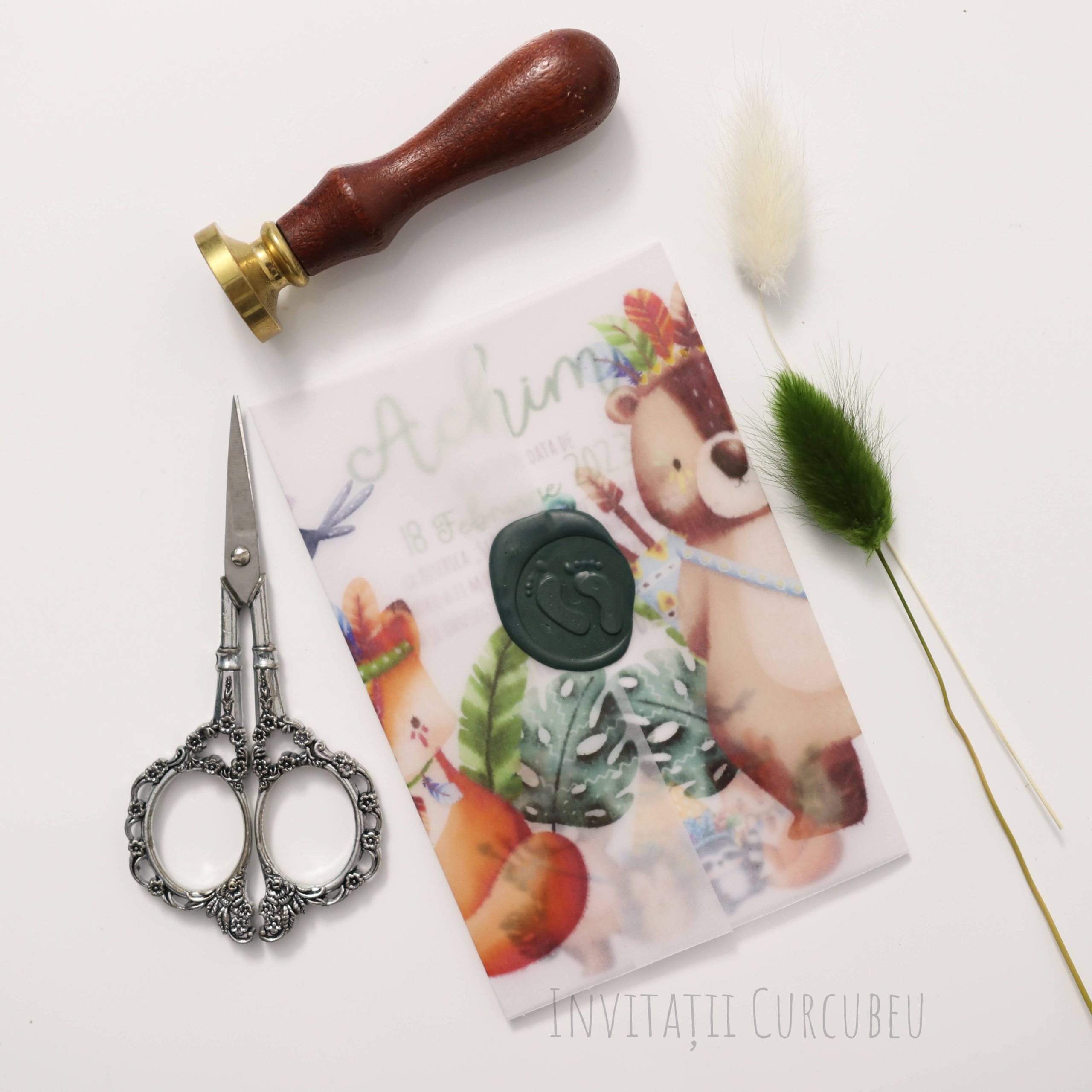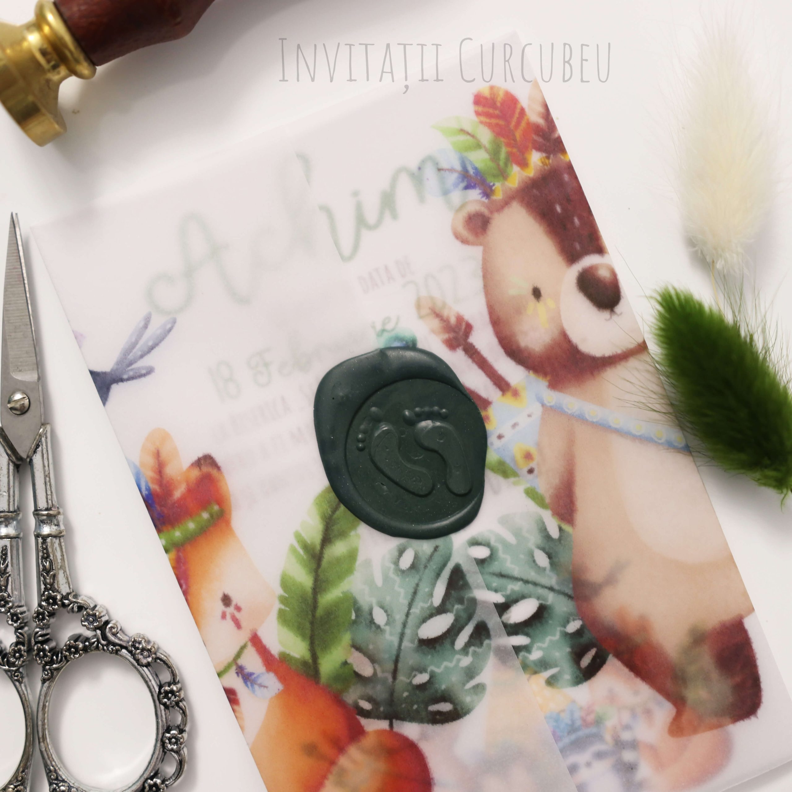 Invitația este ambalată hârtie de calc imprimată și sigiliu de ceară.