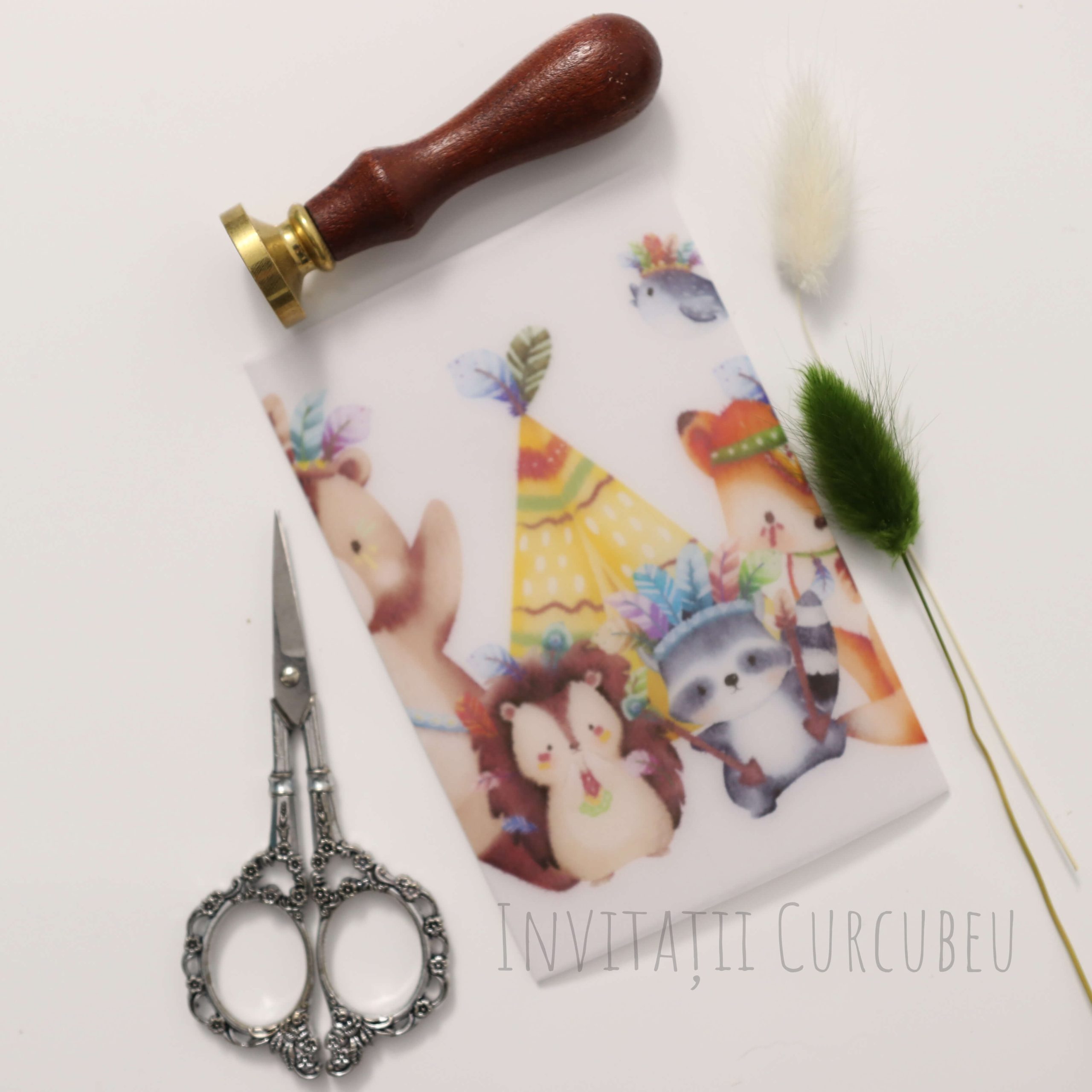 Invitație de botez cu tematica Safari-Indian. Animăluțele prezente sunt deghizate în indieni, ceea ce le dă o alură amuzantă.