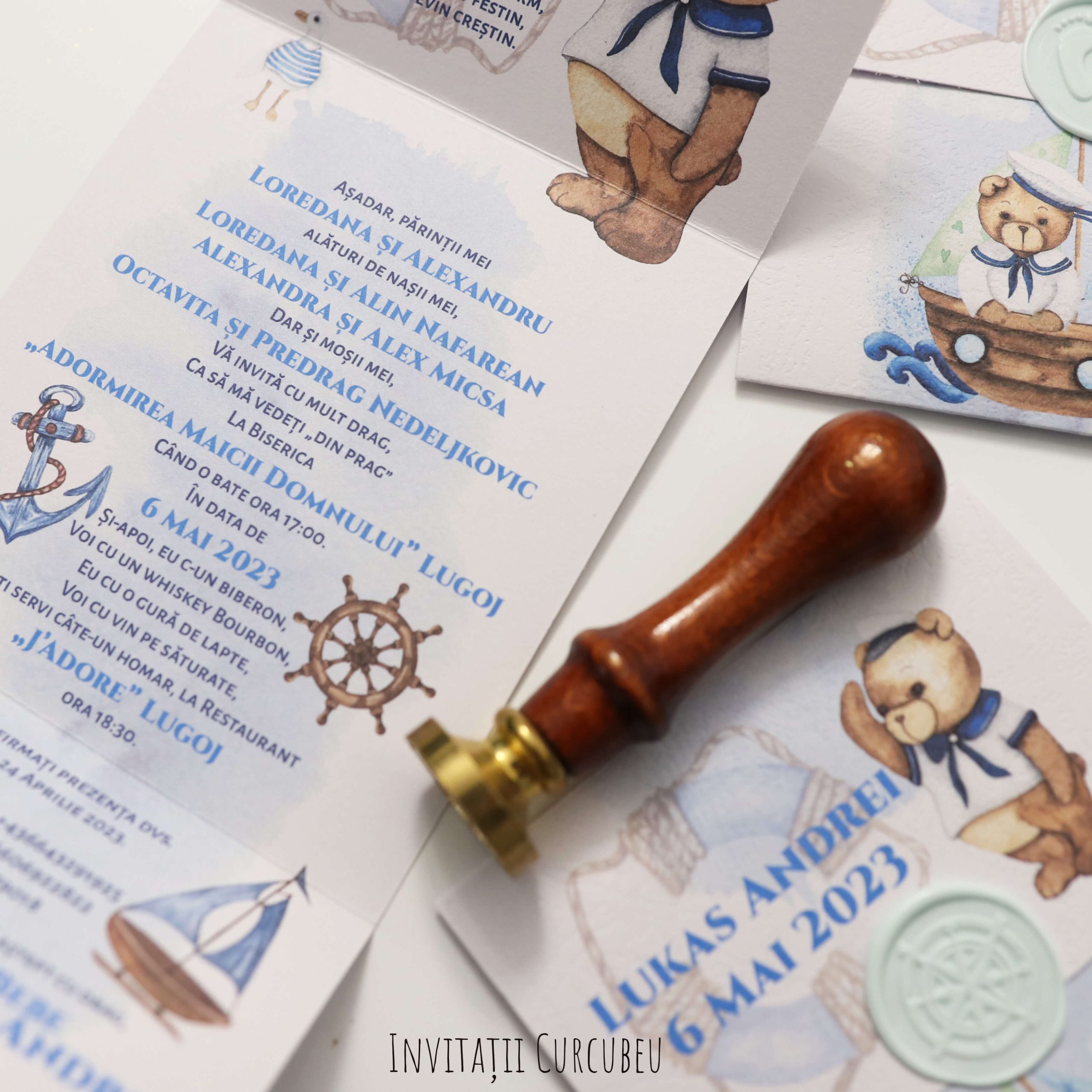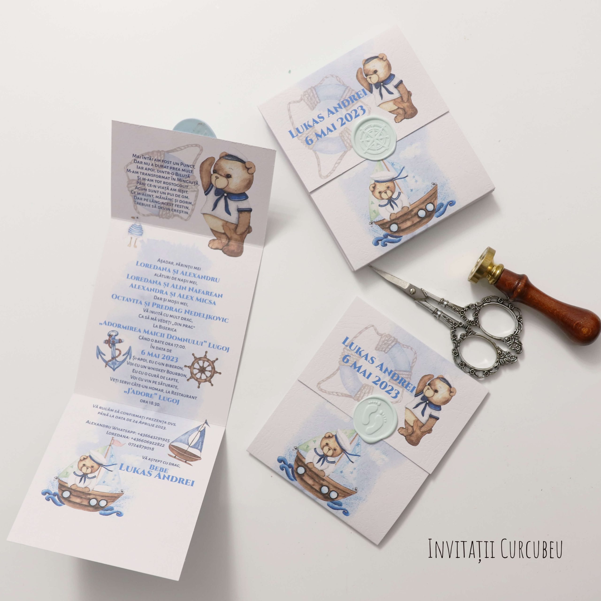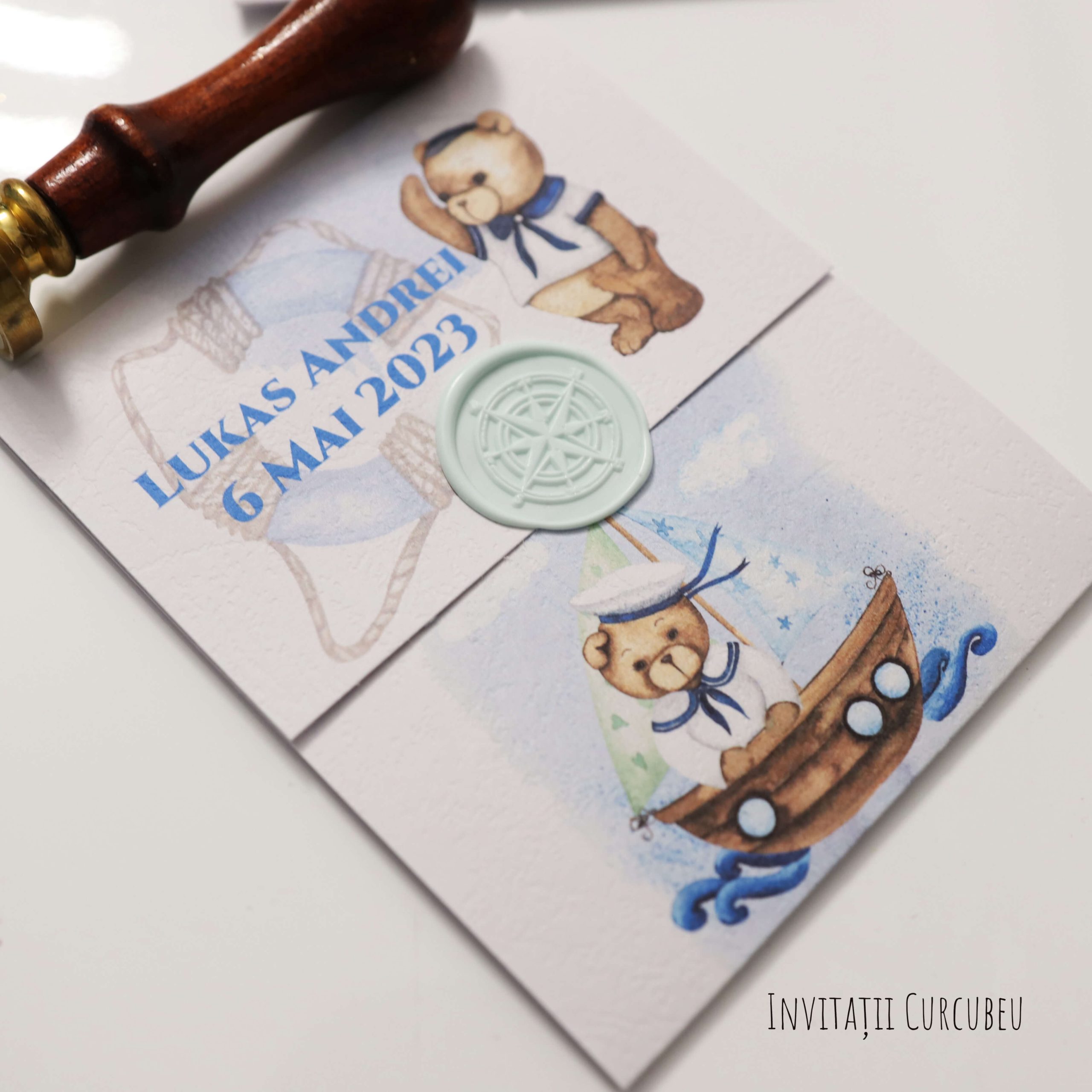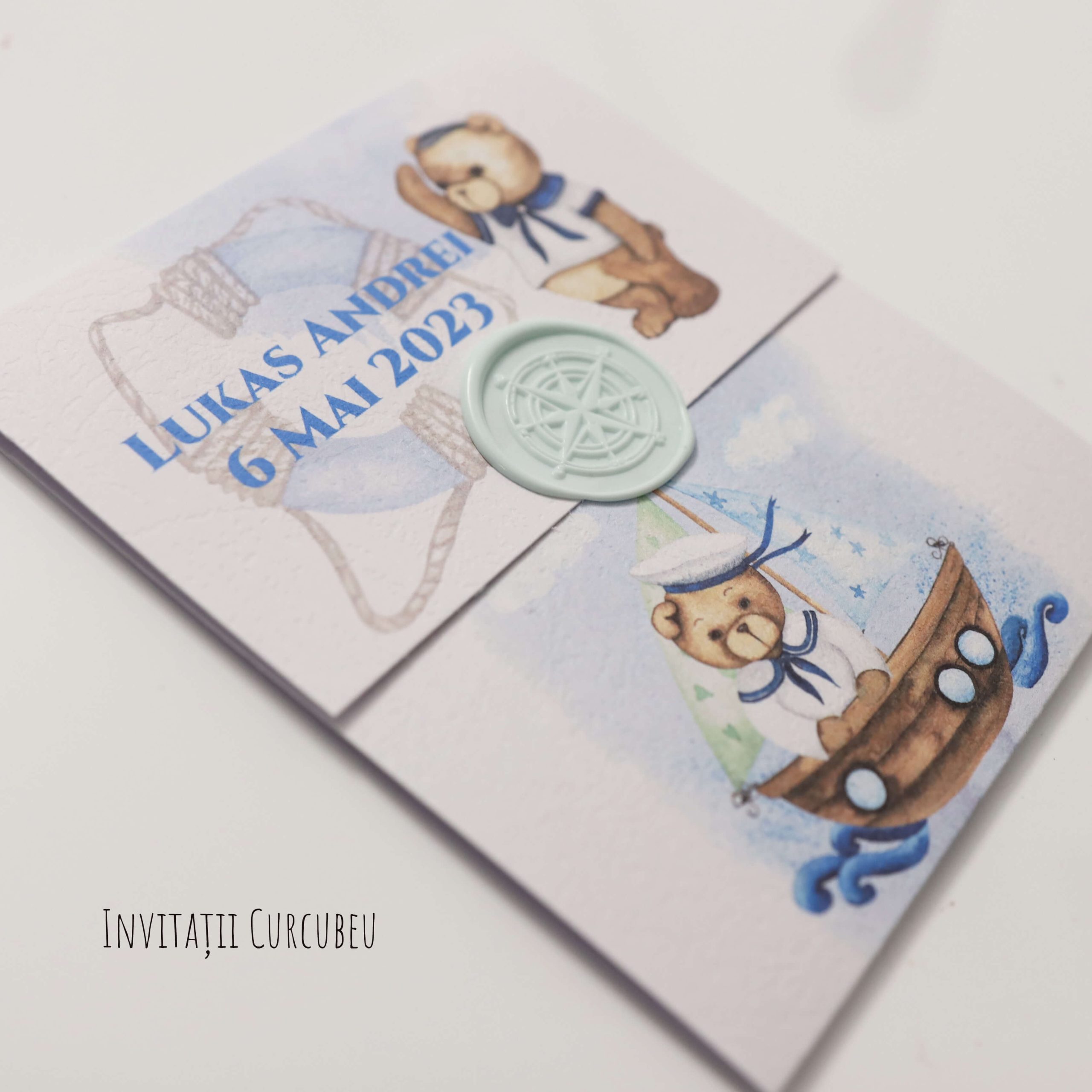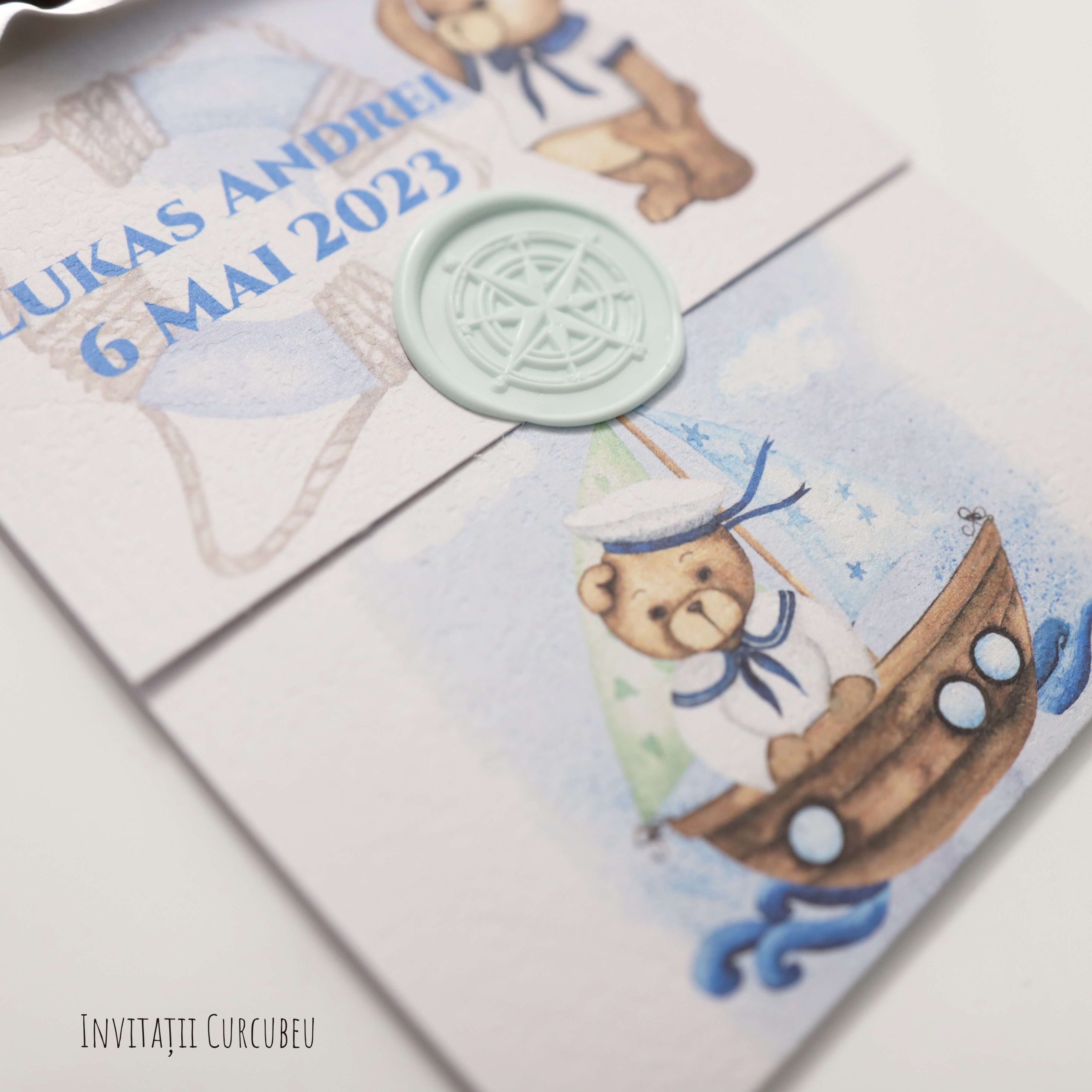 Invitația de botez cu tematica ursuleț marinar. O invitație spațioasă ce permite o grafică extinsă. Are detalii marinărești și nuanțe deschise și mai intense de albastru.