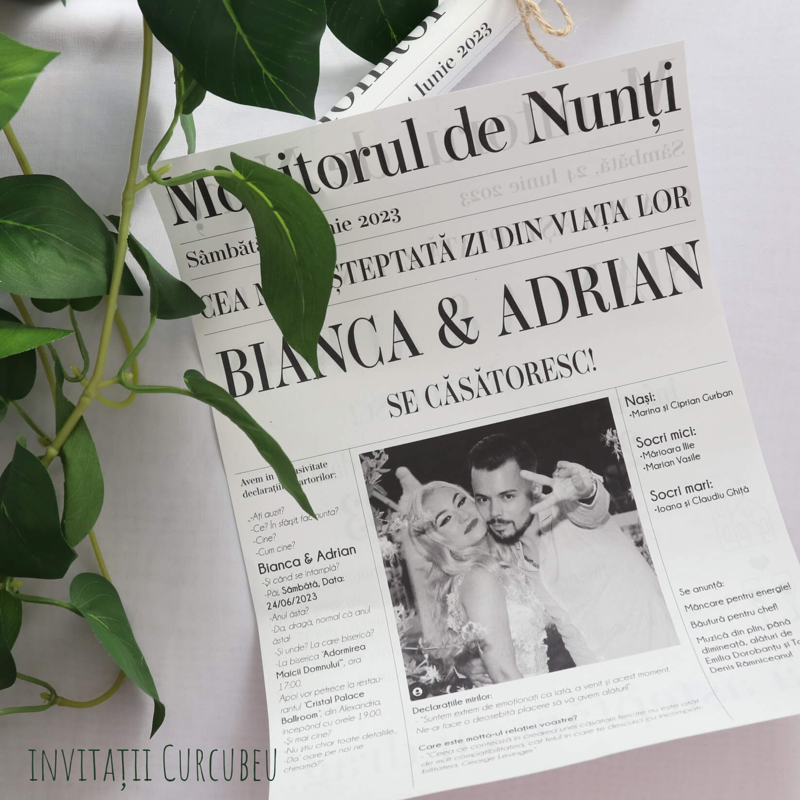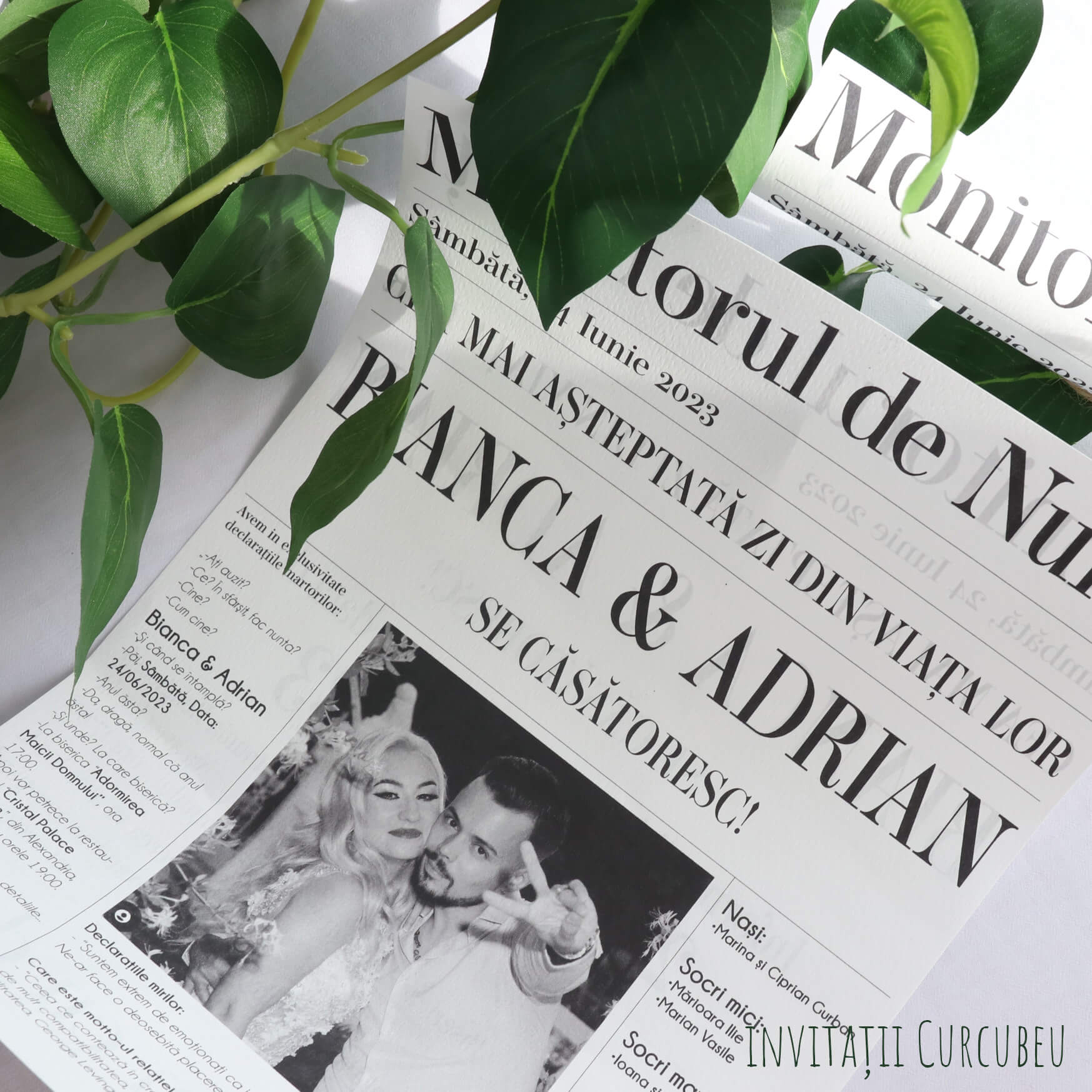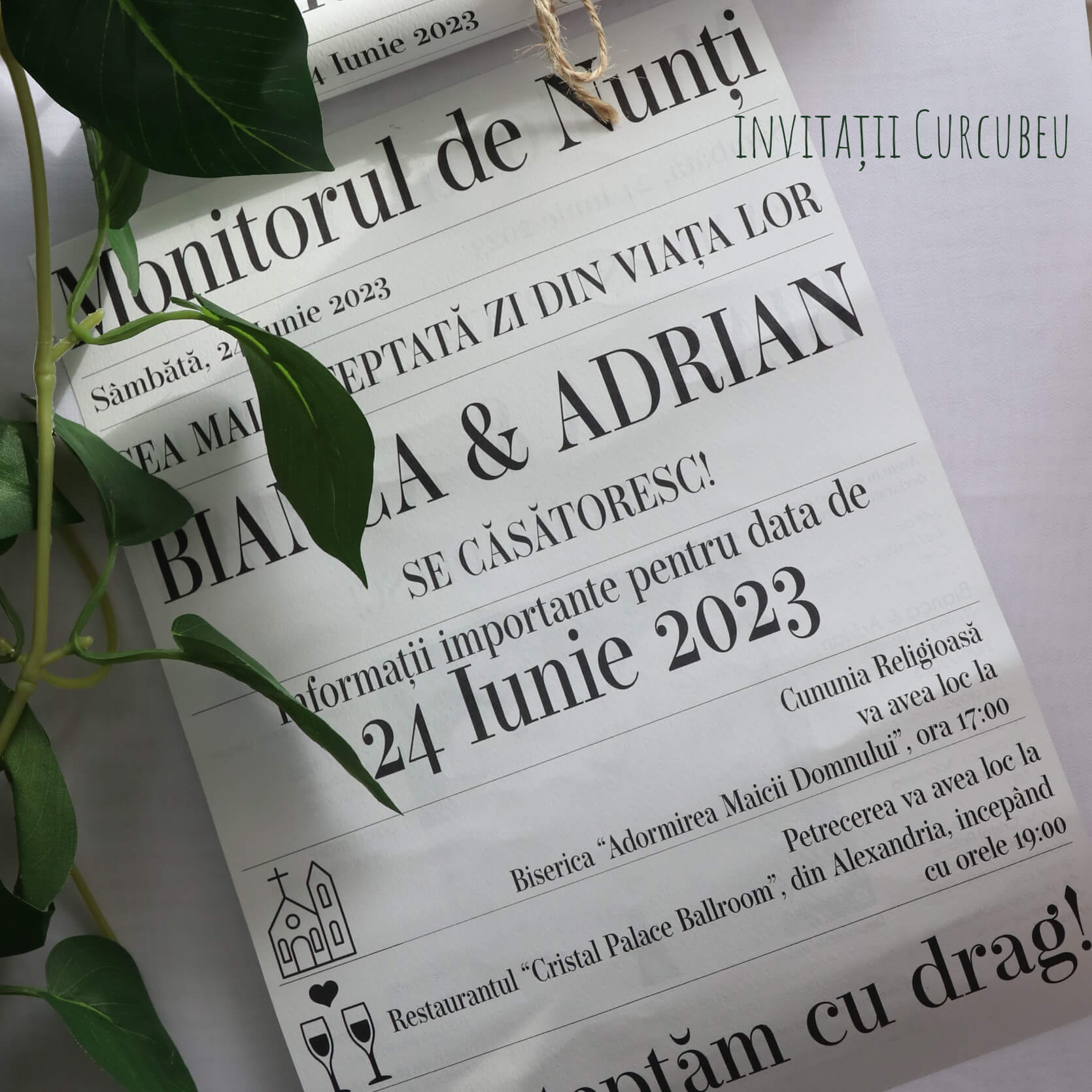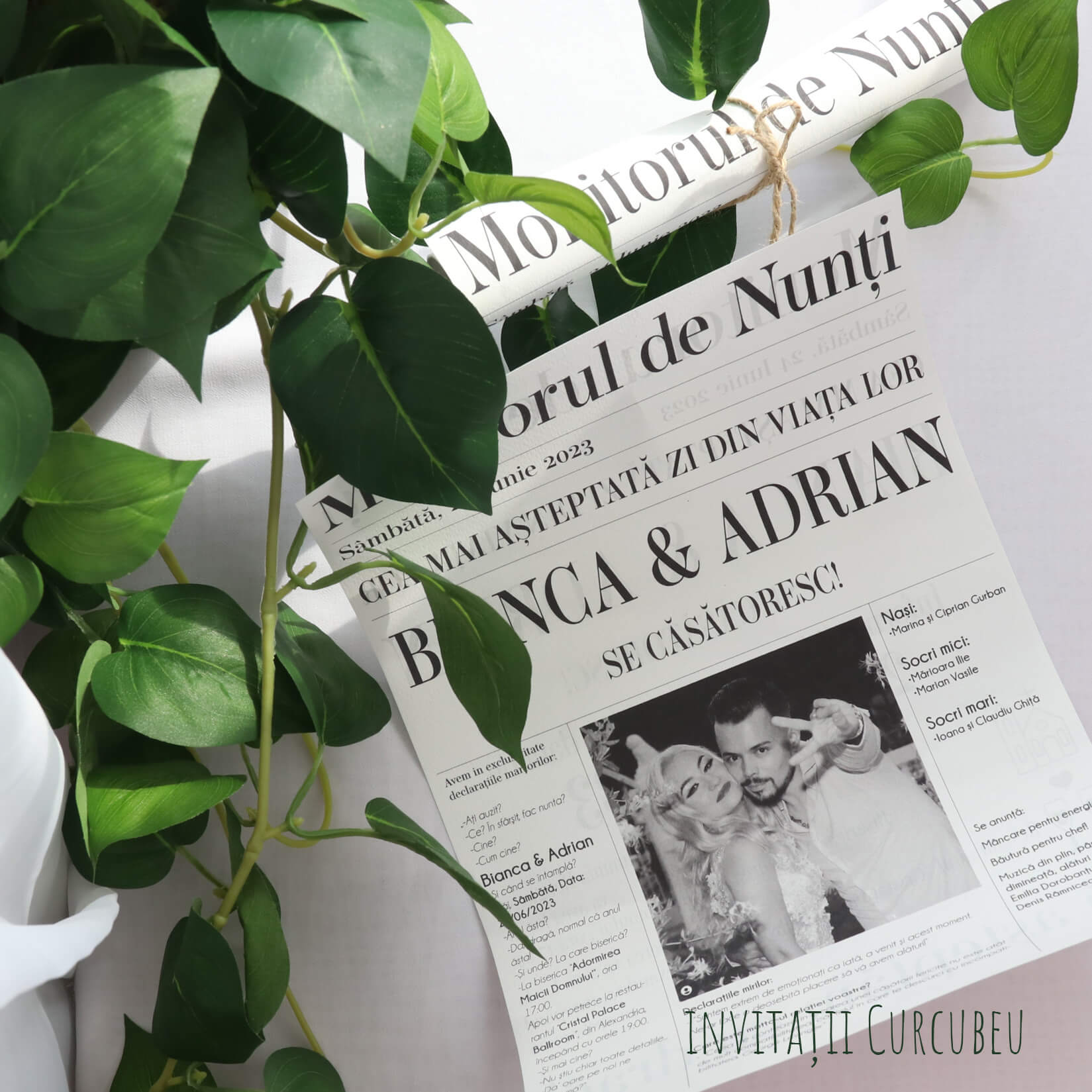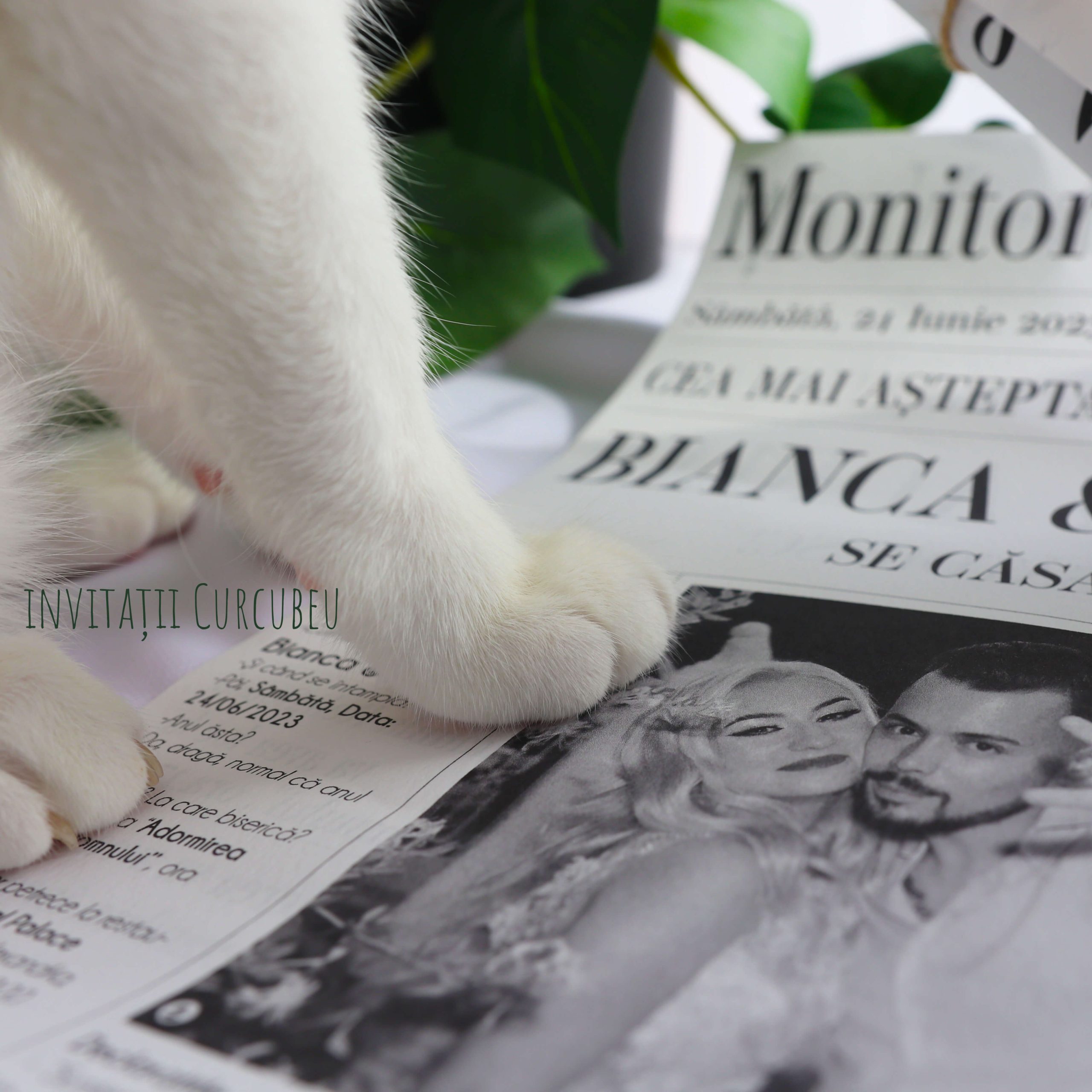 Dă de veste invitaților tăi că faci nuntă. Cum circulă veștile mai bine decât într-un ziar? Dimensiunea ne permite să punem vrute și nevrute în invitație, de la informații până la imagini, citate și alte elemente.