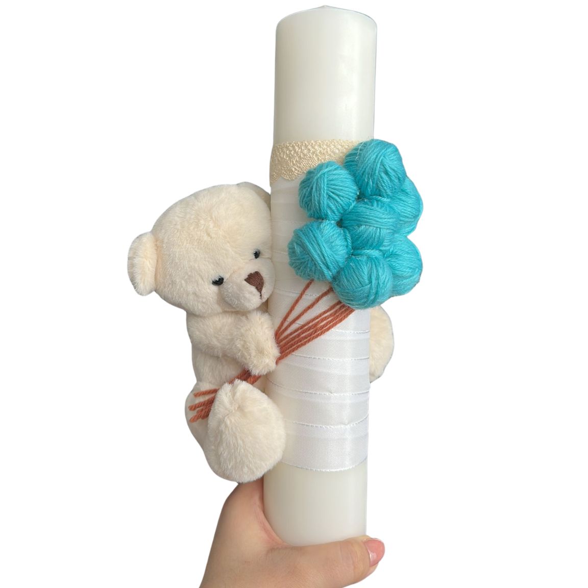 Decorată cu gheme textile în nuanțe de albastru pastel și alb, completate de un ursuleț decorativ atent integrat, lumânarea transmite gingășie și echilibru vizual. Designul este modern, dar păstrează nota clasică potrivită ceremoniei religioase.