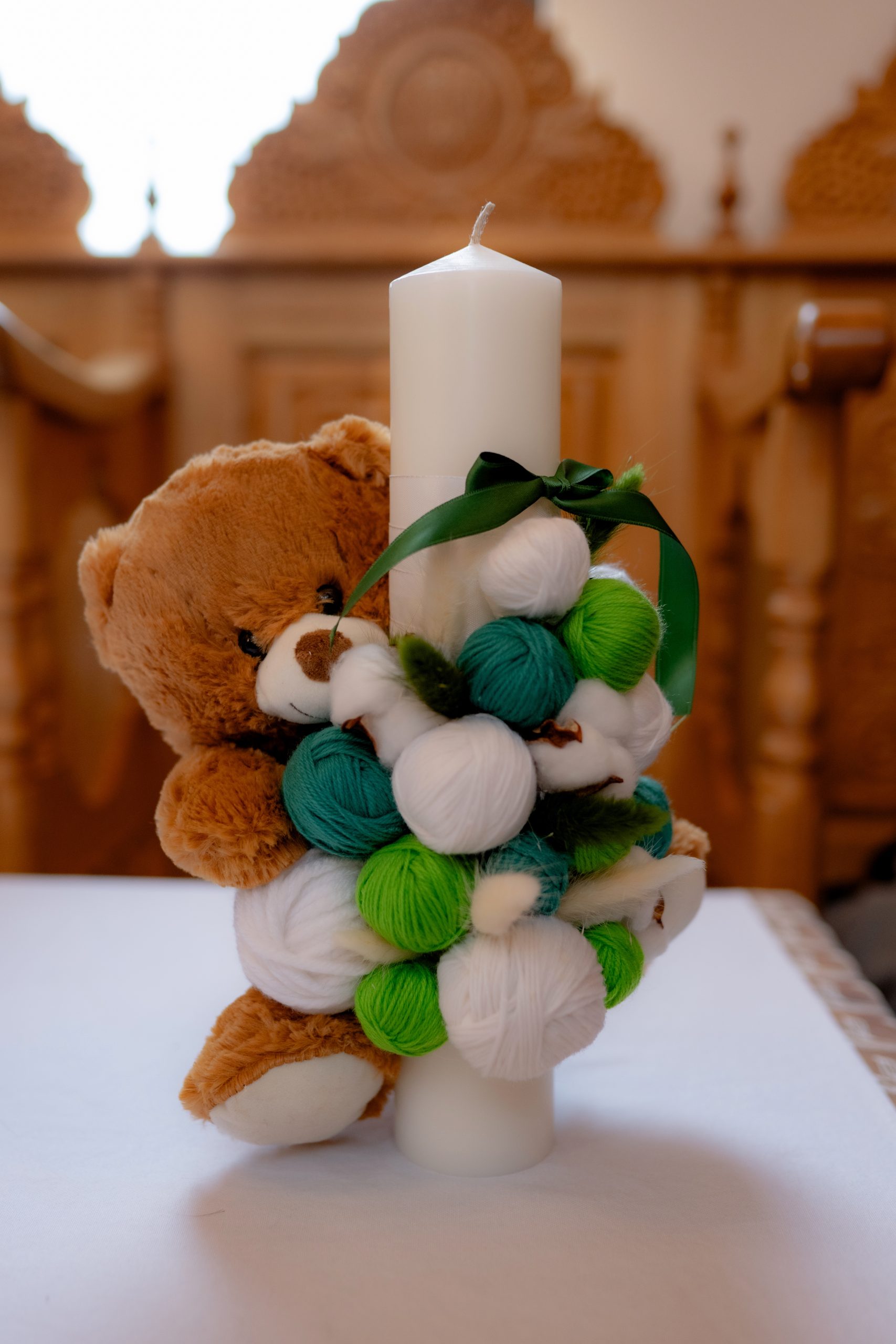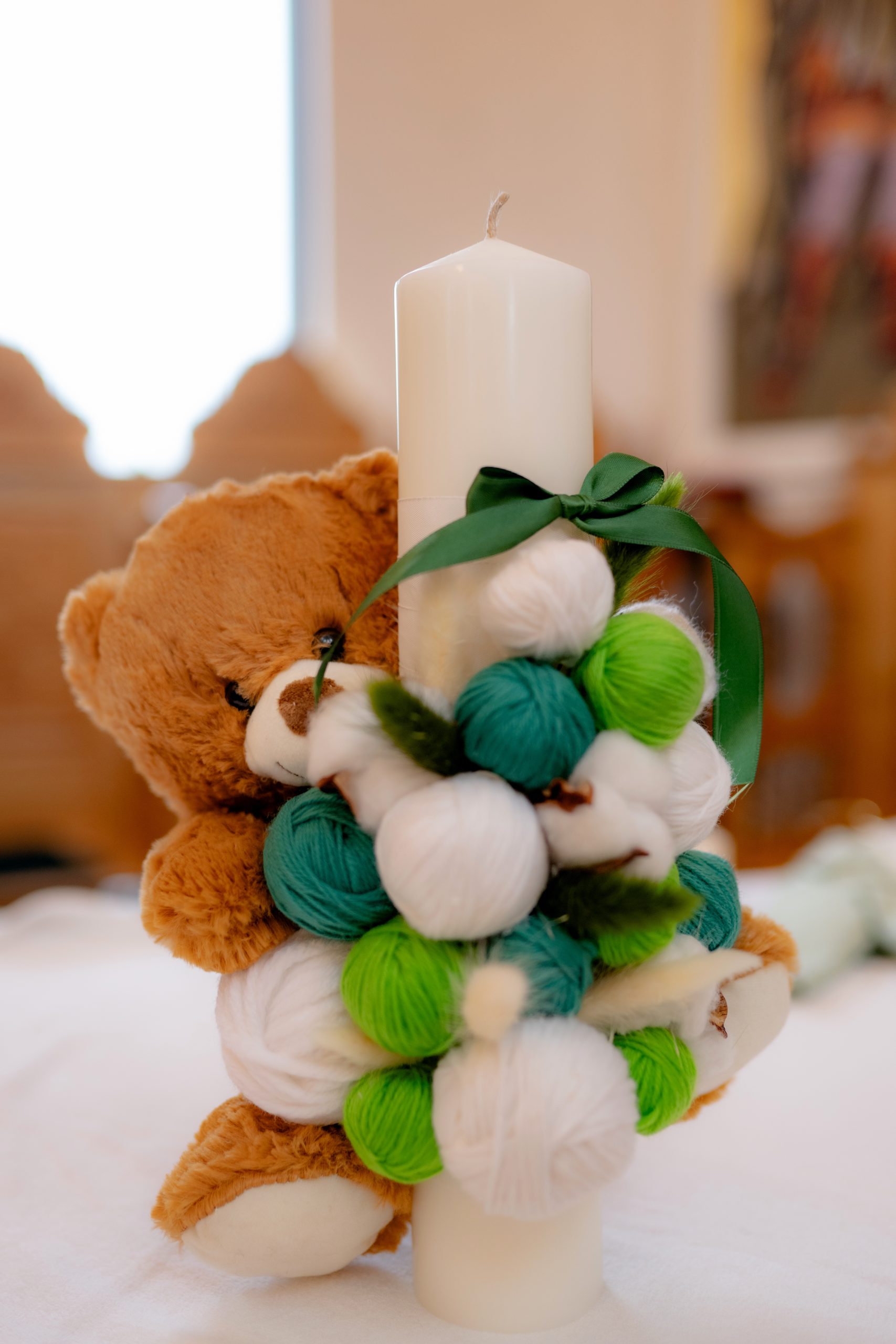 Dacă îți dorești o lumânare de botez personalizată, realizată manual și cu un design modern, acest model cu gheme și ursuleț verde este o alegere inspirată.